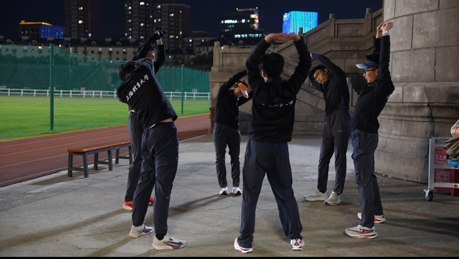 上海体育大学绿瓦跑团的队员在锻真金不怕火。